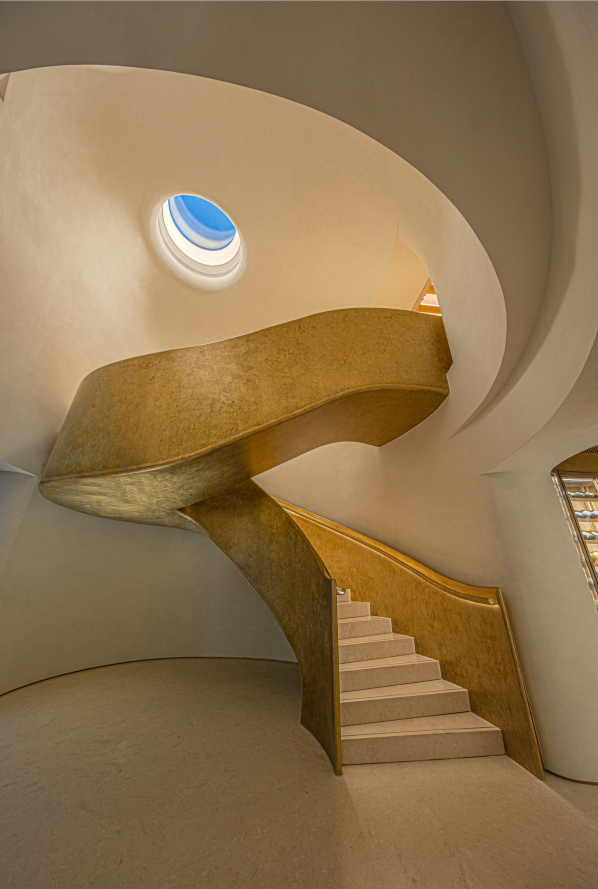 比如门店内部有一个特质的铜制楼梯,颜色为古朴的黄铜色,弯曲弧度与老建筑内部圆形的天顶、天窗相得益彰,像一条舞动的金色飘带。