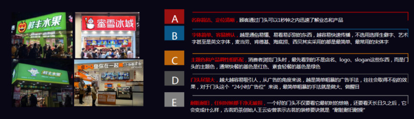 策略二是要重视门头,门头简单明亮比一味追求“高大上”要好。比如名称要简洁,定位要清晰,顾客通过门头可以1秒钟之内迅速了解业态和产品。
